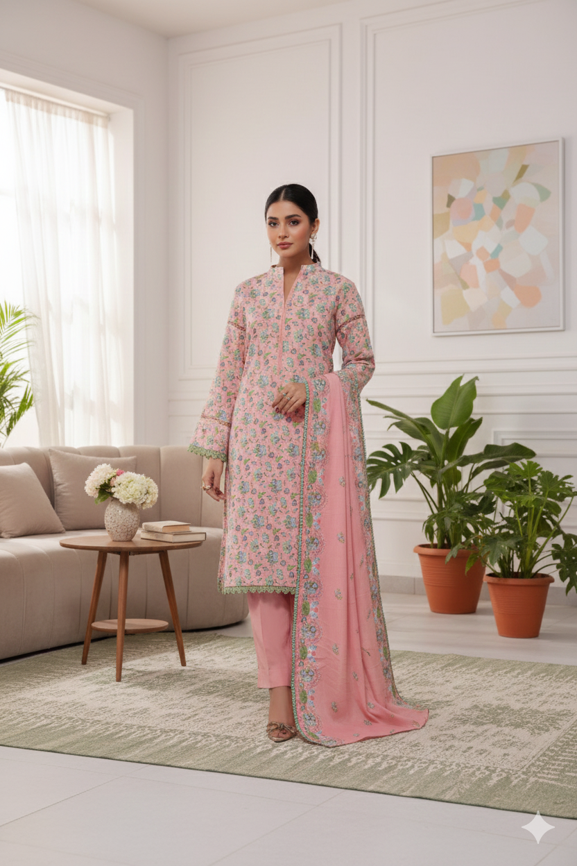 THREE PIECE PRINTED WRINKLE FREE/WASH & WEAR DRESS.