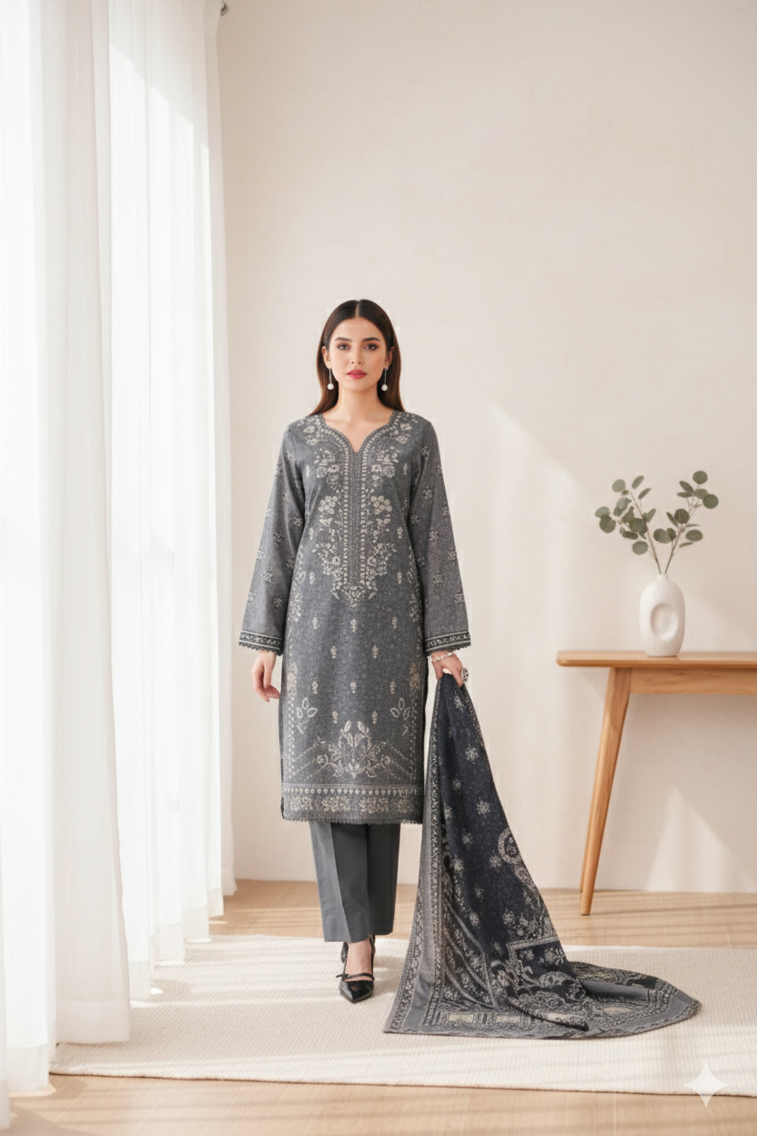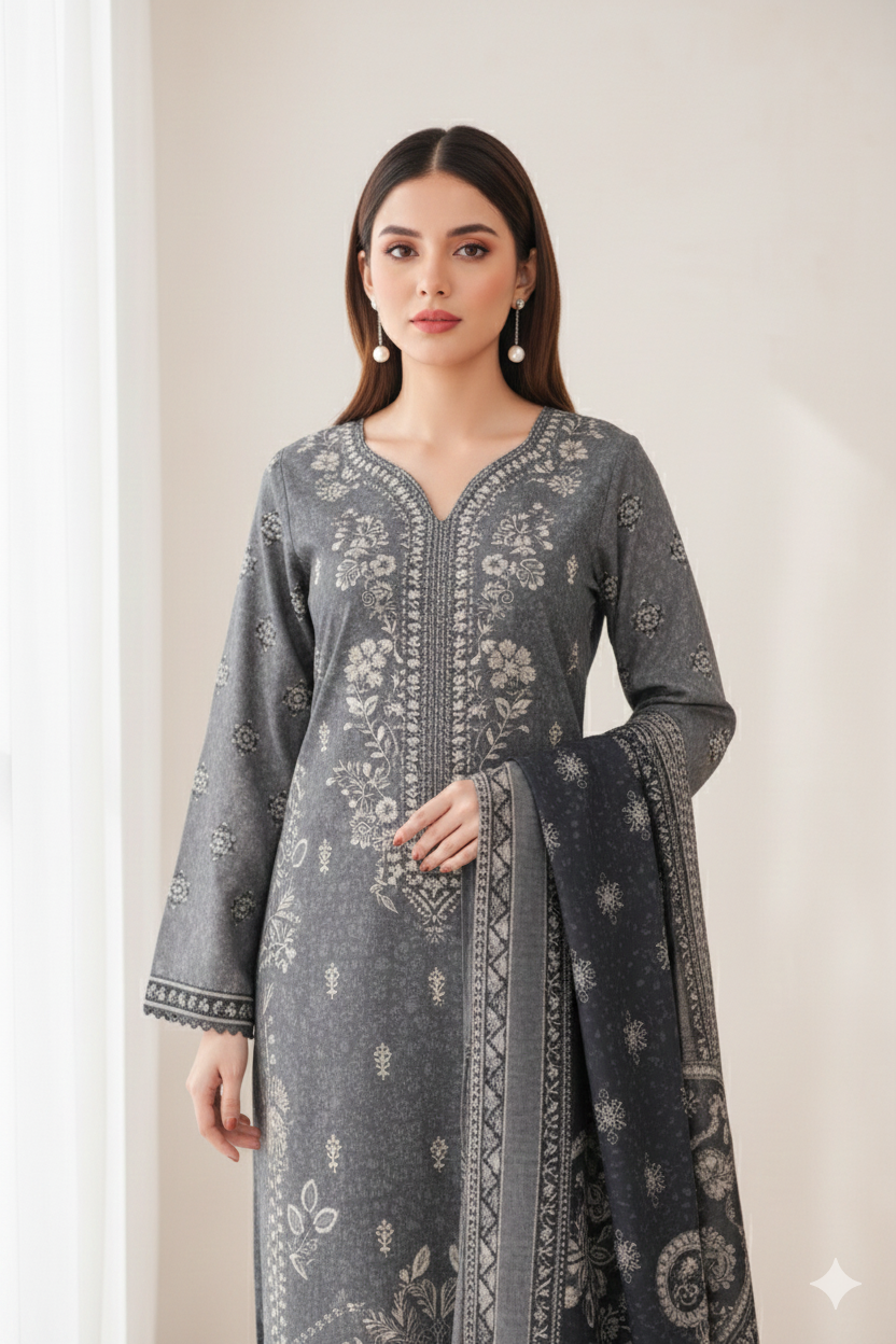 THREE PIECE EMBROIDERED UNSTITCHED KHADDAR WINTER DRESS.