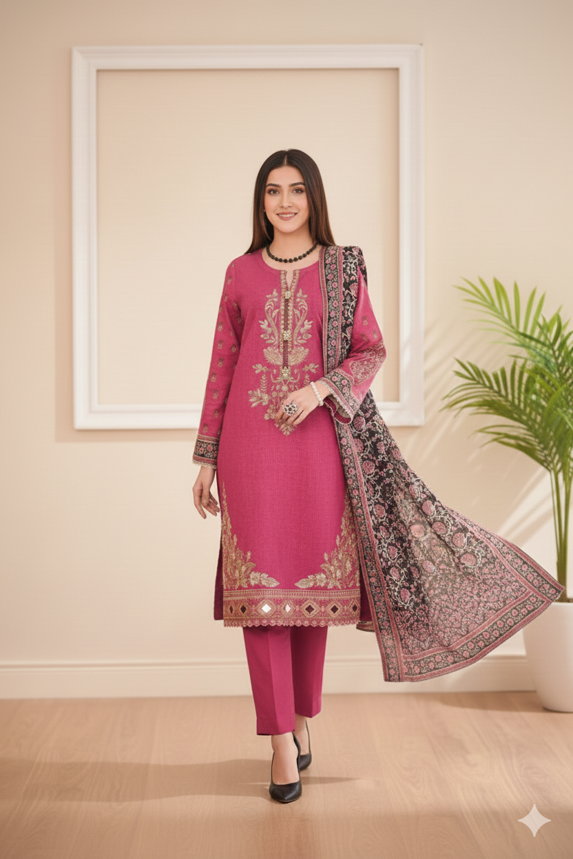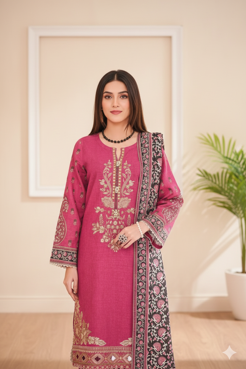 THREE PIECE EMBROIDERED UNSTITCHED KHADDAR WINTER DRESS.