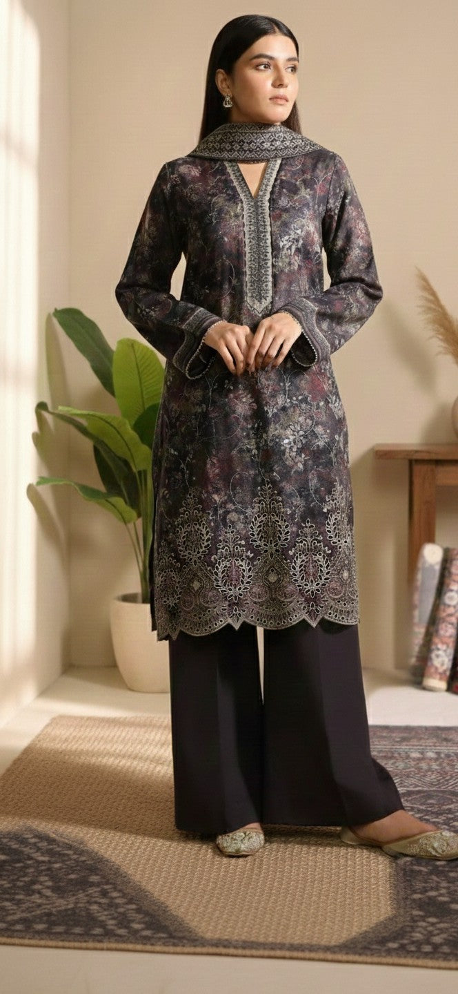 THREE PIECE EMBROIDERED UNSTITCHED KHADDAR WINTER DRESS.