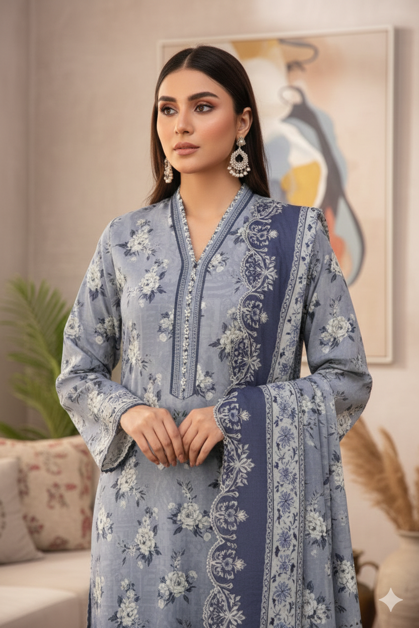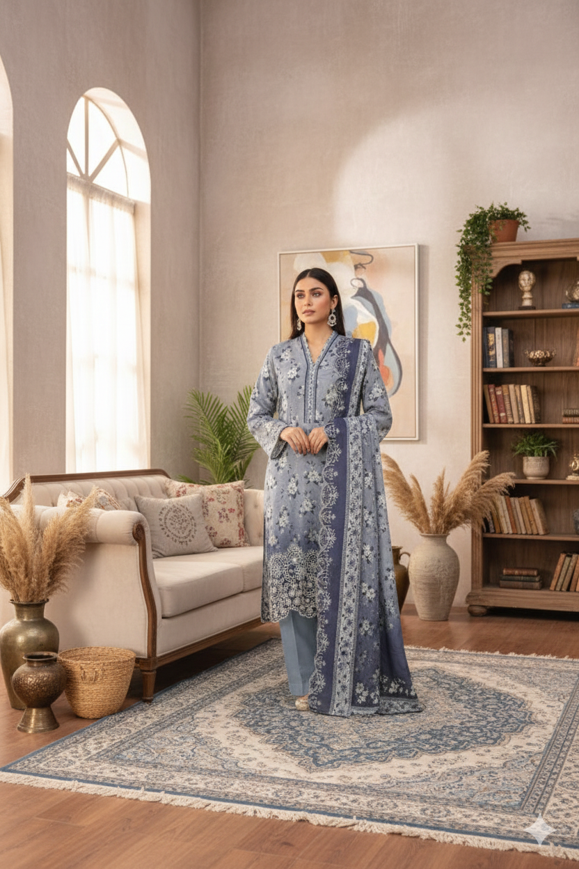 THREE PIECE EMBROIDERED UNSTITCHED KHADDAR WINTER DRESS.