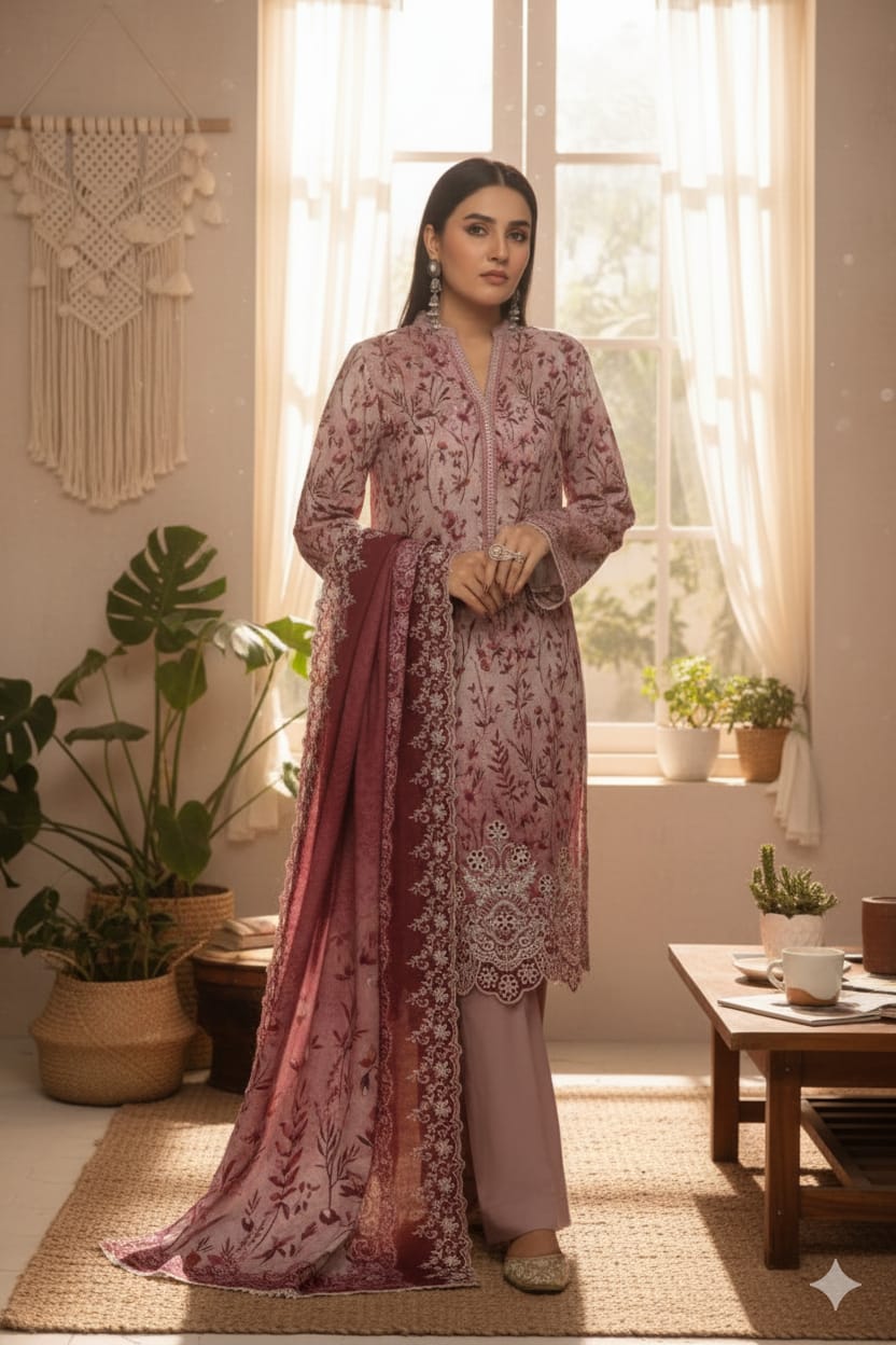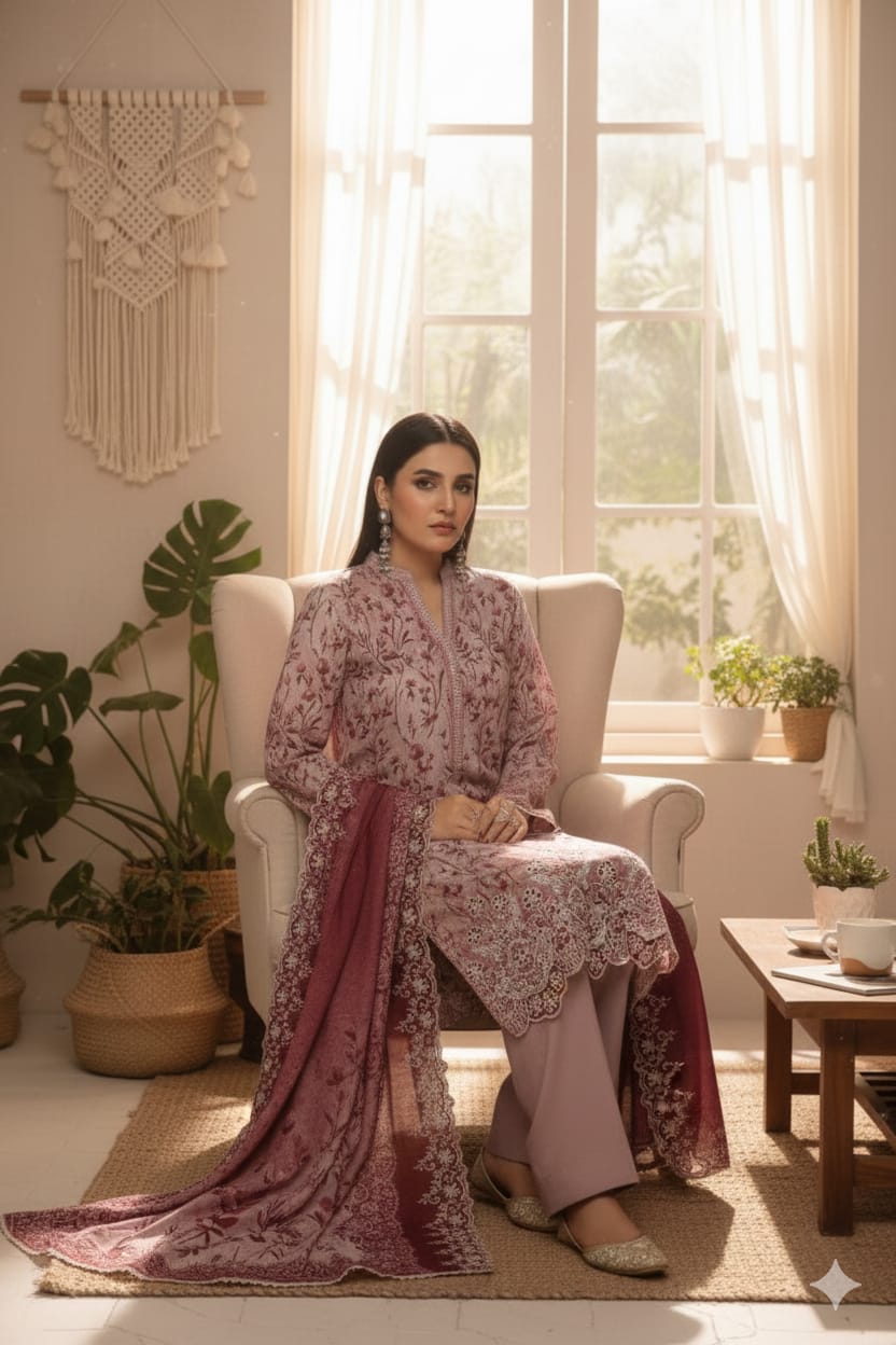 THREE PIECE EMBROIDERED UNSTITCHED KHADDAR WINTER DRESS.